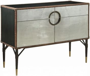 With its riveted patchwork of polished aluminum, the Brancaster console table is inspired by mid-20th-century air travel. This unique console piece features ample storage with two drawers and cabinet space with two doors, all supported by tapered metal legs. A masterful example of form and function.Read More