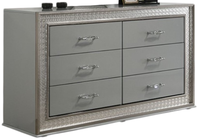 The Furniture of America® Cassiopeia Metallic Gray Dresser offers a modern metallic gray finish that adds sophistication to any bedroom. With multiple spacious drawers, it provides ample storage for clothing and accessories. Its sturdy construction ensures lasting durability while offering both style and functionality to your space.Read More