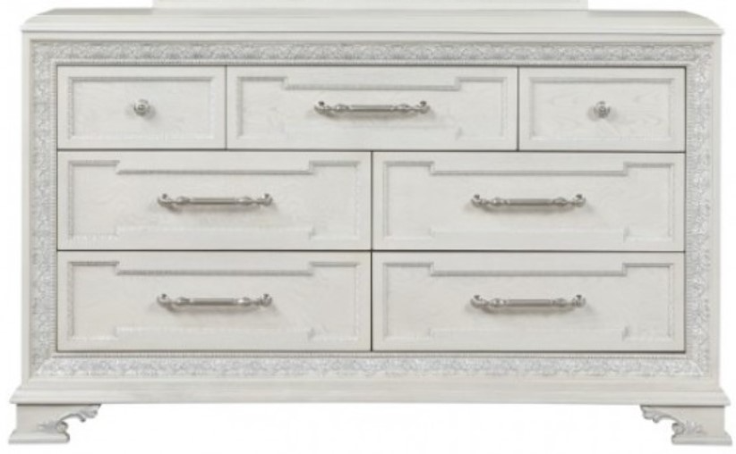 The Stella Mia Creamy White Dresser is a traditional piece that combines elegance with functionality. Crafted from pinewood, ash burl veneer, oak veneer, fabric, foam, and engineered wood, it features a creamy white finish adorned with ash burl and silver brushed ornate accents.Read More